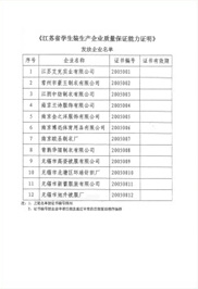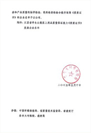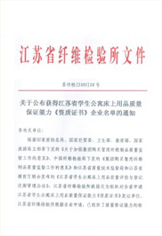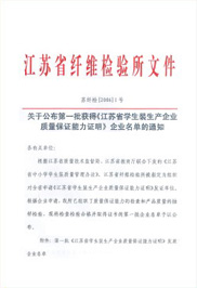 公司获得IS09001质量管理体系认证证书,2006年获评第一批江苏省纤维检验所认 定的学生装质量保证企业,2005年被江苏省纤维检验所认定为
